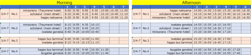 Please find the shuttle bus schedule for Misorano, Nakiyama, and Echoland below.