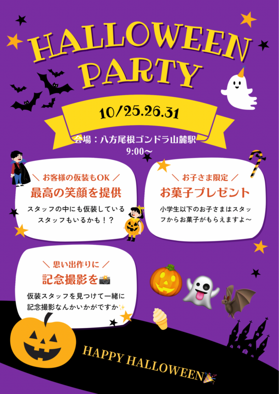 突然ですが、ゴンドラチームからお知らせ致します。10/25【土】、26【日】、31【金】にハロウィンイベントを行いたいと思います!子供たち(小学生以下)にお菓子をプレゼントしちゃいますよ~🍬スタッフの中には、仮装をしているスタッフも!?村男も仮装している!?見つけて一緒に記念撮影なんかいかがでしょうか📸大人でも楽しめるようになっております。是非、お越しくださいませ。
