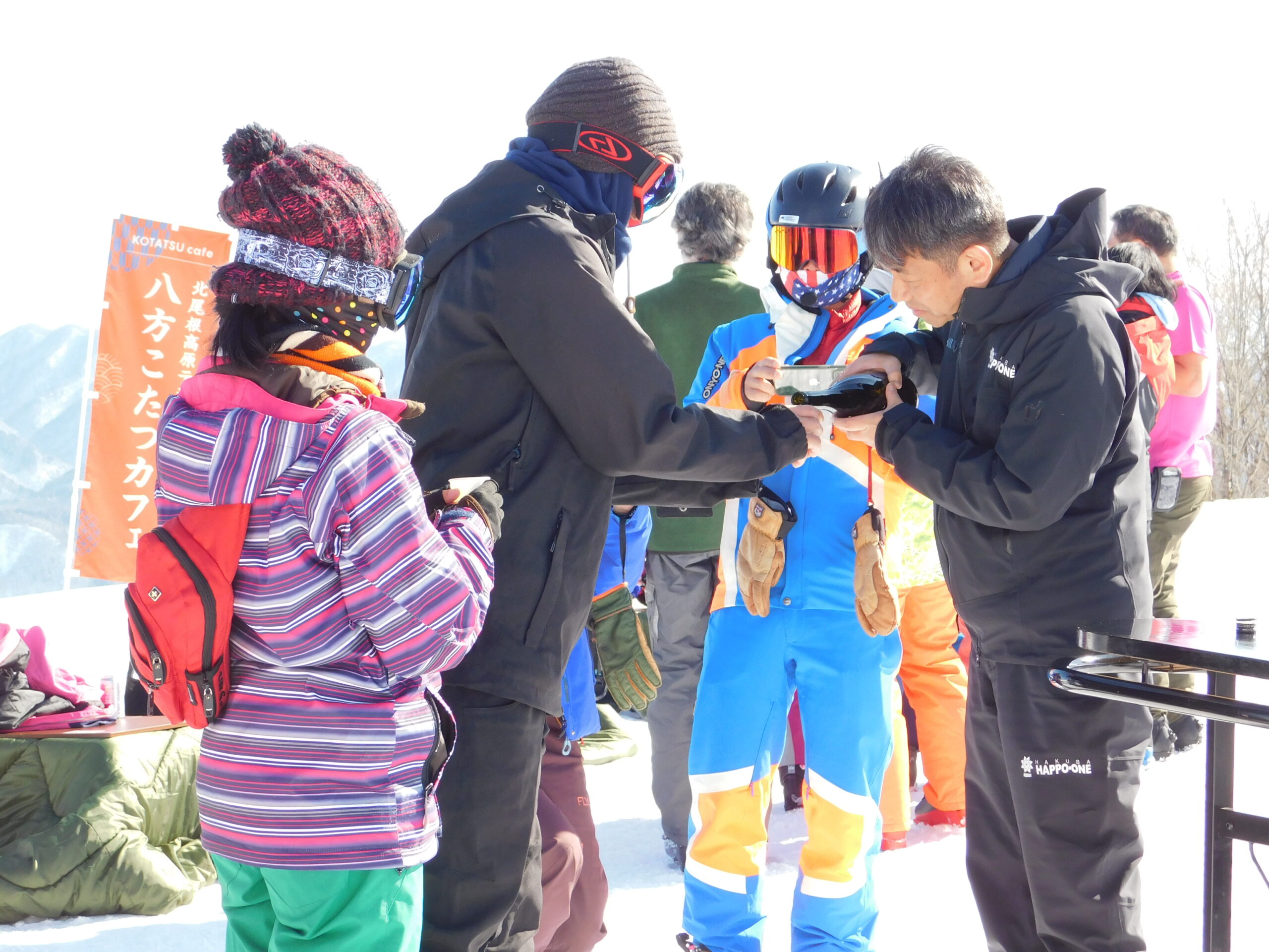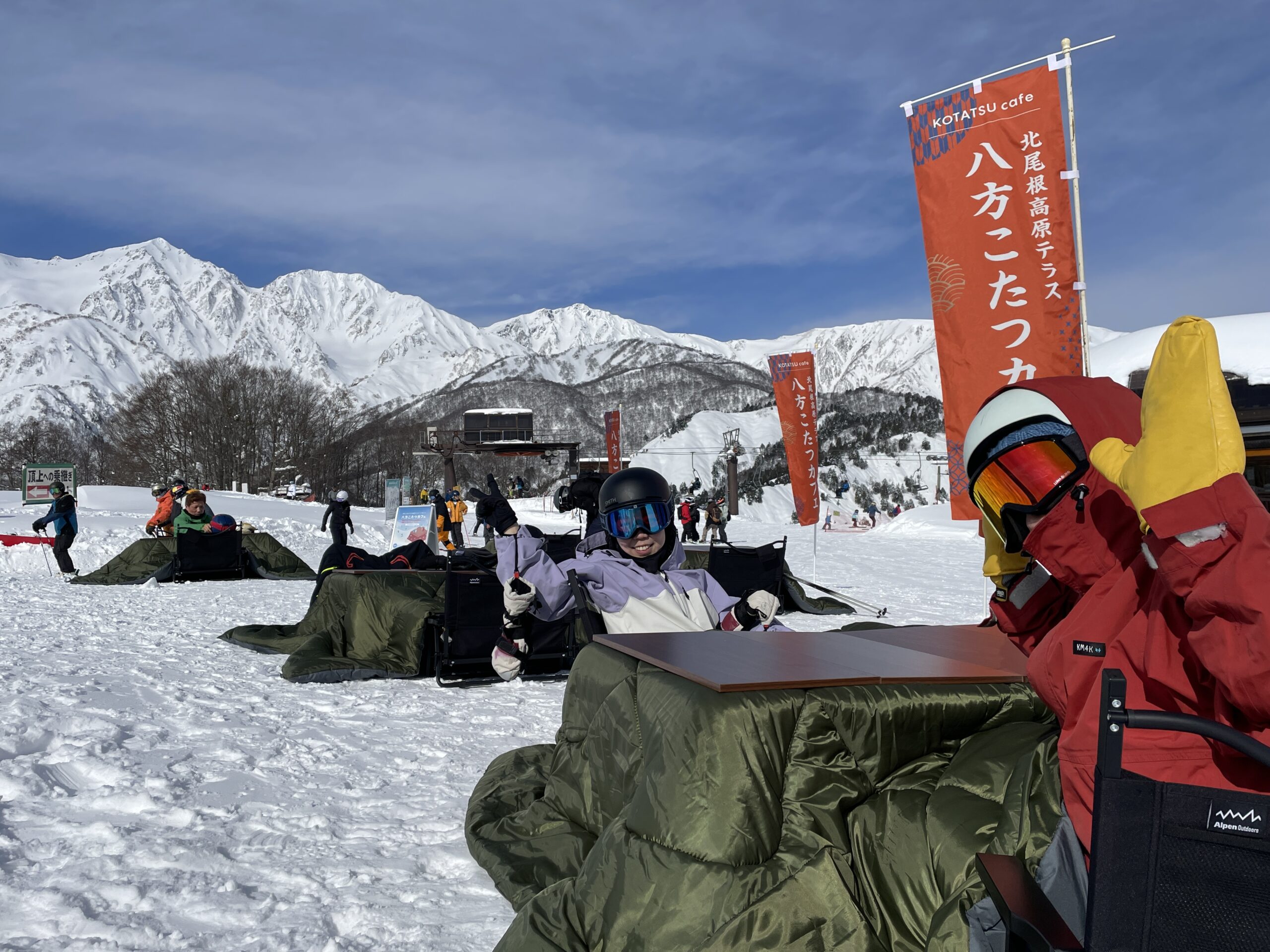 白馬三山の冬の絶景をこたつの中であたたまりながら楽しむカフェ「八方こたつカフェ」が標高1,200mの北尾根高原にオープン!毎週土日に営業しており既にご好評いただいております!北尾根高原テラスで提供するテイクアウトメニューをこたつでお楽しみいただける他、週替わりで、日本の冬の定番でほっと心をあたためるおしるこや、ドリンクなどを数量限定で11時から振る舞い予定(なくなり次第終了)。