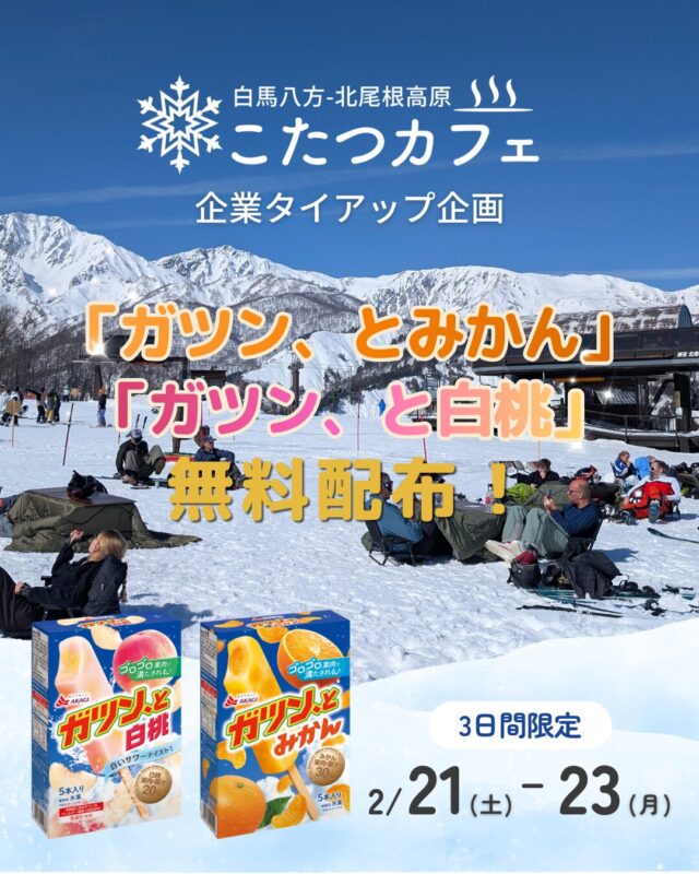 白馬八方尾根・北尾根高原❄️こたつカフェ × 企業タイアップ企画 第一弾❄️ 今回は赤城乳業株式会社の「ガツン、とみかん」を 数量限定で無料提供します! さらに…2月23日(月)新発売「ガツン、と白桃」の 先行試食も実施🍑✨