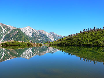 白馬三山を水面に映す八方池までのハイキングコースは、日本百名山の11峰が見渡せる絶景スポットが点在しており、澄んだ空気の日には第1ケルンから「富士山」も望めます。